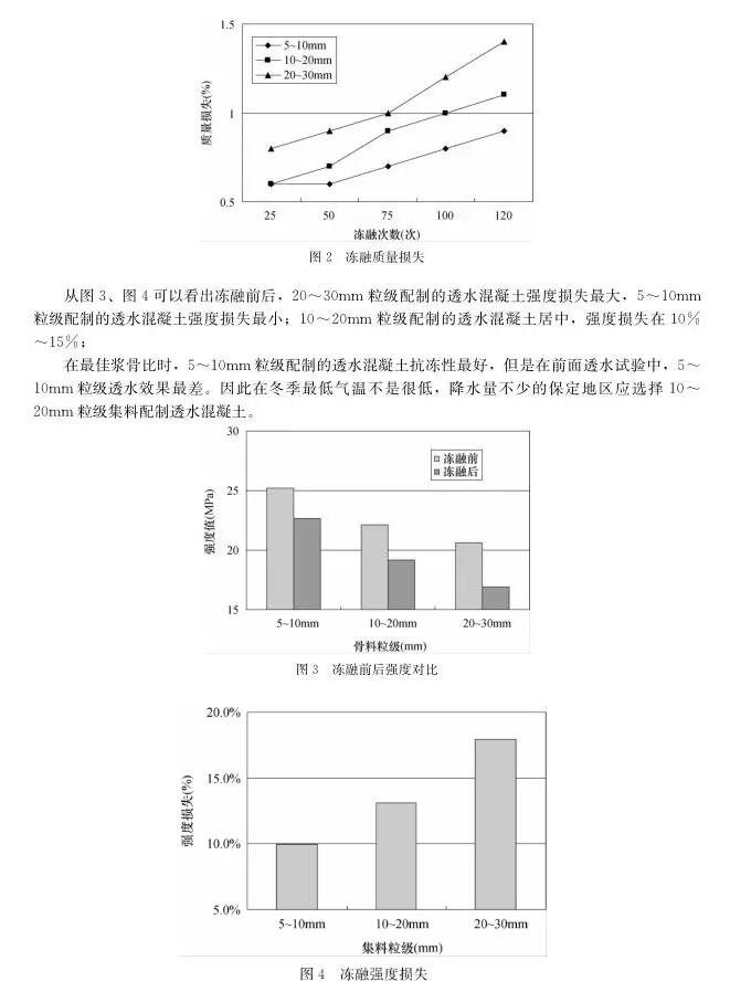 目前我國在透水混凝土方面的研究取得了突破性的進展,透水混凝土廣泛應用與城市便道、非機動車道、人行道,高強度、高性能透水混凝土在城市主干道中也有應用,但有關透水混凝土抗凍性研究較少。透水混凝土內部含有較多的孔隙,當水結冰時,水壓力推動水向邊界排除,透水混凝土內部將受到推移水分前進的反作用力。當水壓力大于水泥漿體的抗拉強度時,水泥漿體將受拉破壞,此時透水混凝土內部可能出現(xiàn)裂縫,從而縮短使用壽命。因此,本文針對透水混凝土的抗凍性能展開研究實驗,尋找透水系數(shù)、抗壓強度與抗凍性能的關系,配制最佳透水混凝土的配合比。