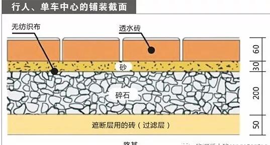 人行道透水路面結構層從上到下依次為透水磚(面層)、水泥砂漿結合層、透水混凝土(基層)、素混凝土墊層、灰土墊層。具有透水的功能,可以有效減少城市內澇,降低熱島效應的作用。